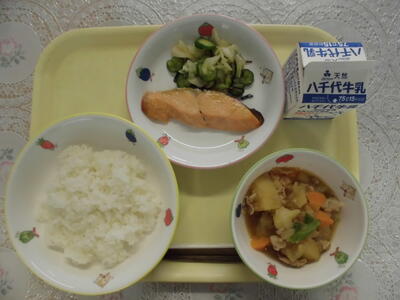 6月22日(木) 鮭の西京焼き、肉じゃが、塩こんぶキャベツ、ごはん、牛乳でした。