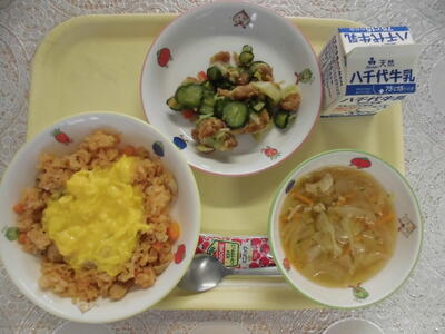 今日の献立は、チャーハン、揚げシュウマイ、ささみときゅうりの中華和え、白ごまプリン、牛乳です。