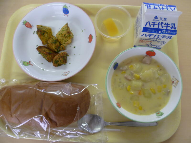 黒糖パン(袋入り)、米粉の豆乳コーンシチュー、青のりポテト、クールゼリー(もも)、牛乳です。