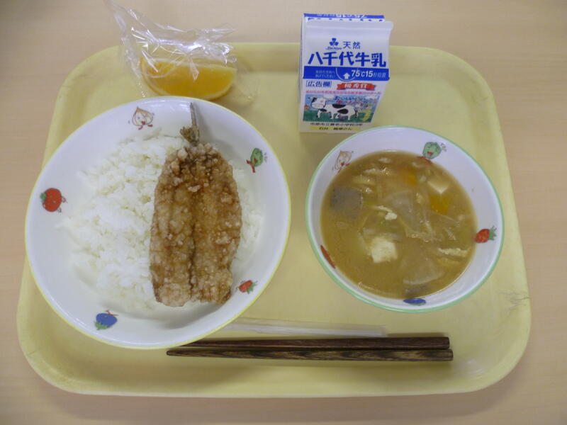 ごはん、いわしのかば焼き、豚汁、オレンジ、牛乳です。