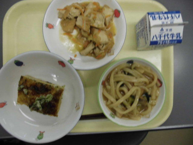きつねうどん、お好み焼き、生揚げの味噌炒め、牛乳です。