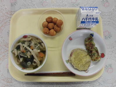 今日は、香川県の郷土料理「しっぽくうどん」、「ちくわ」と「さつまいも」の天ぷら、きなこ白玉、牛乳でした。