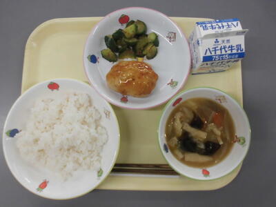今日の献立は、つくねの照り焼き、きゅうりのおかか和え、ごはん、具だくさん味噌汁、牛乳です。