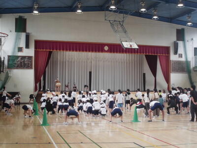 業間休みには、体育館で希望者による応援練習です。みんな一生懸命です。