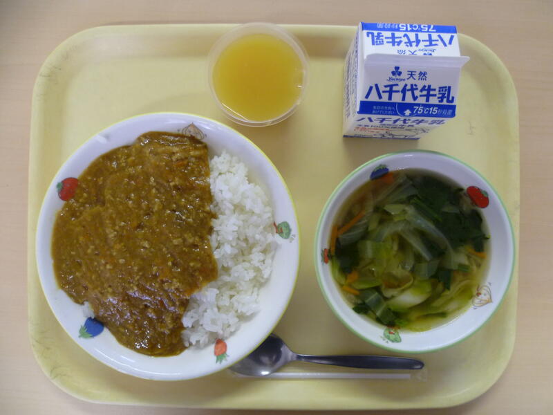 キーマカレー、とり野菜スープ、オレンジゼリー、牛乳です。