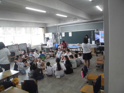 4年生 体育 マット運動の際の注意点についての話をみんな真剣に聞いています。