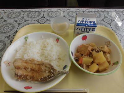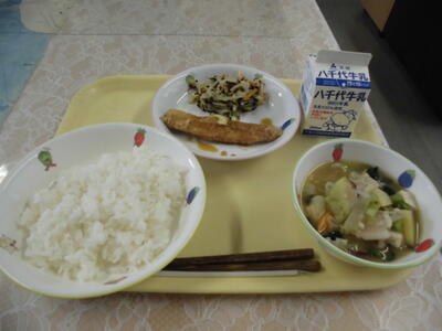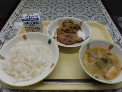 ご飯、サバの味噌煮、けんちん汁、牛乳です。