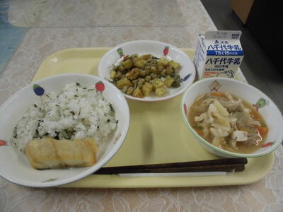 ご飯、生揚げの肉みそに、茎わかめのキンピラ、いちご、牛乳です。