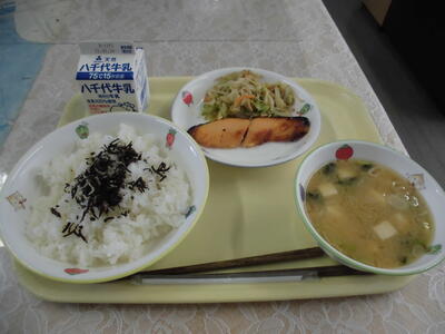 わかめご飯、イワシのレモン揚げ、豚汁、牛乳です。