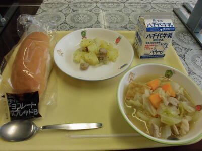 きなこ揚げパン、ジャーマンポテト、肉団子スープ、牛乳です。