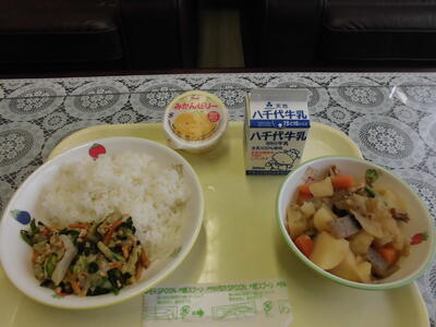 ご飯、肉じゃが、納豆和え、牛乳です。