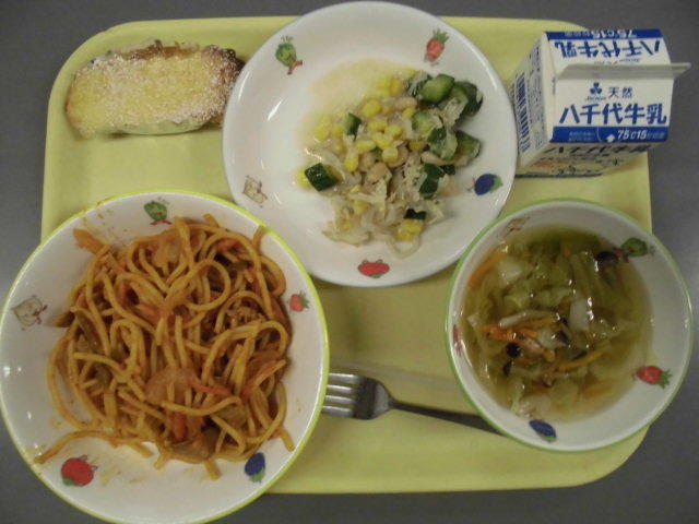 ナポリタン、ビーンズサラダ、きゃべつスープ、焼きチーズケーキ、牛乳です。