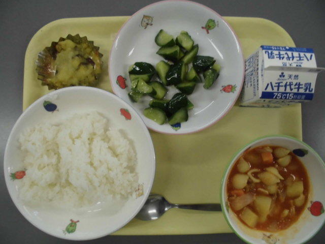 ごはん(胚芽パンから変更となっています)、ミネストローネ、フレンチきゅうり、さつまいもバター焼き、牛乳です。