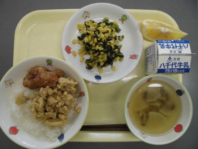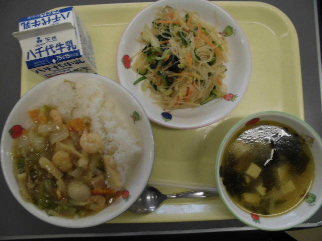 中華丼、春雨サラダ、わかめスープ、牛乳です。
