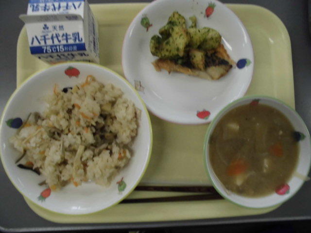 五目御飯、ほっけの一夜干し、あおのりポテト、豚汁、牛乳です。