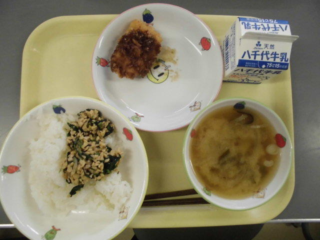 ごはん、たくあん納豆和え、イカフライ、味噌汁、牛乳です。