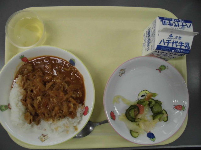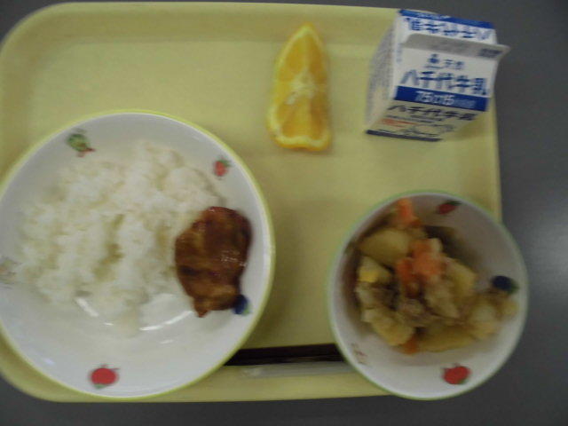 ごはん、鶏肉のコチュジャン焼き、肉じゃが、あまなつ、牛乳です。