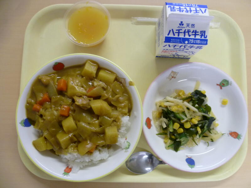 チキンカレーライス、海藻サラダ、寒天オレンジゼリー、牛乳です。