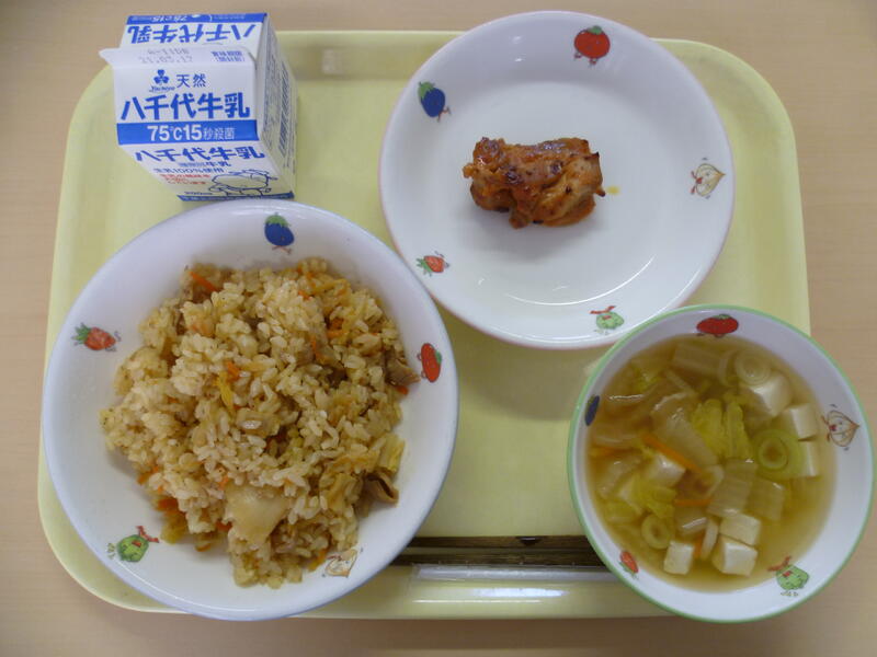 キムチご飯、鶏肉のみそケチャップ焼き、白菜スープ、牛乳です。