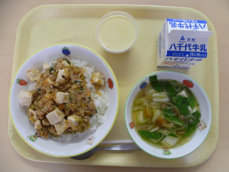 マーボー丼、春雨スープ、プリン、牛乳です。
