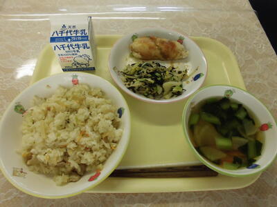わかめご飯、イワシのレモン揚げ、豚汁、牛乳です。