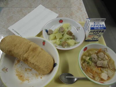 きなこ揚げパン、ジャーマンポテト、肉団子スープ、牛乳です。