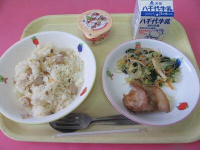 本日の献立は、ウインナーピラフ・ローストチキン・春雨サラダ・クリスマスデザート・牛乳です。