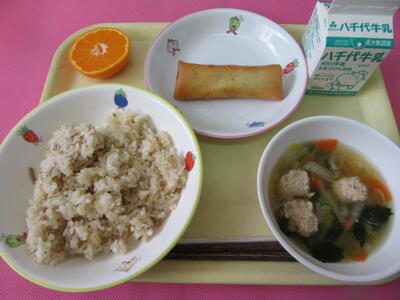 本日の献立は、じゃこガーリックライス・ポテトサラダ春巻き・鶏団子スープ・牛乳です。