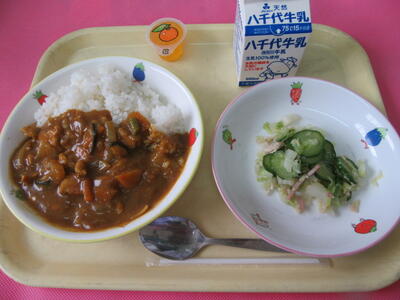 本日の献立は、夏野菜カレー・コールスローサラダ・ひとくちゼリー・牛乳です。