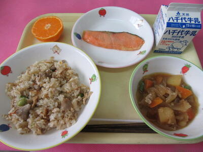 本日の献立は、とりめし、鮭の西京焼き・肉じゃが・花みかん・牛乳です。