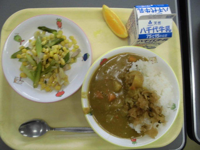 チキンカレー、福神漬け、アスパラコーンソテー、オレンジ、牛乳です。
