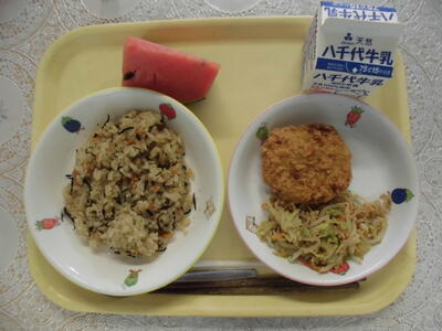 今日の献立は、ひじきそぼろご飯、おからコロッケ、ごま和え、小玉すいか、牛乳です。
