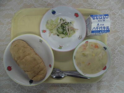 今日の献立は、きなこ揚げパン、コールスローサラダ、コーンチャウダー、牛乳です。