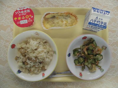 今日の献立は、ウィンナーピラフ、白身魚のチーズ焼き、くきわかめサラダ、元気ヨーグルト、牛乳です。