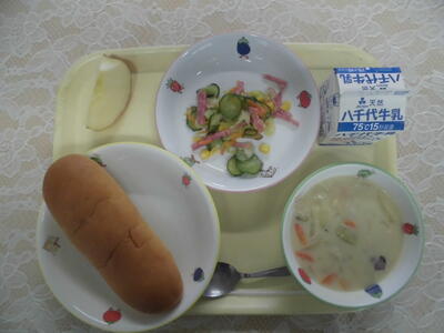 今日の献立は、さつま芋パン、秋のクリームシチュー、サラミのサラダ、りんご、牛乳です。