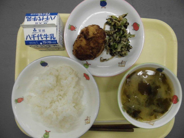 ごはん、キャベツメンチ、磯香和え、味噌汁、牛乳です。