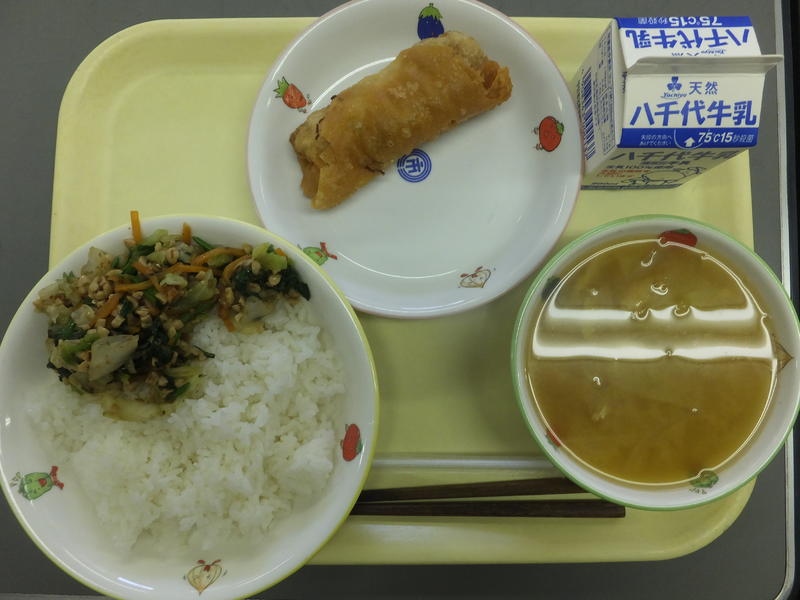 ごはん、春巻き、納豆和え、じゃがいもの味噌汁、牛乳です。