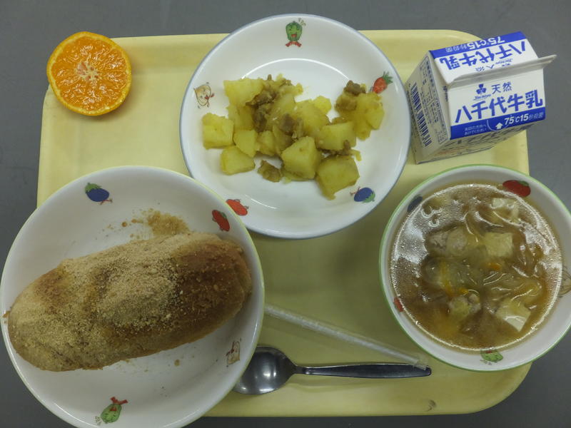 きなこ揚げパン、肉団子スープ、カレーポテト、みかん、牛乳です。