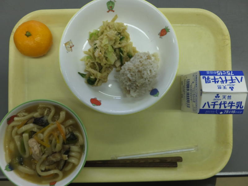 にこみうどん、もち米シューマイ、切り干し大根ナムル、みかん、牛乳です。