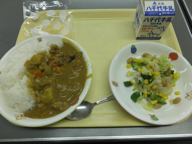 チキンカレー、福神漬け、ビーンズサラダ、冷凍パイン、牛乳です。