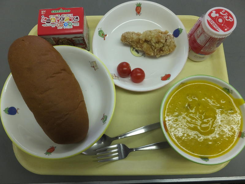 黒パン、フライドチキン、ミニトマト、カボチャの豆乳スープ、チョコケーキ、乳酸菌飲料です。