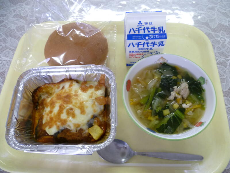夏野菜のミートグラタン、鶏野菜スープ、まるパン(個包装)、牛乳です。