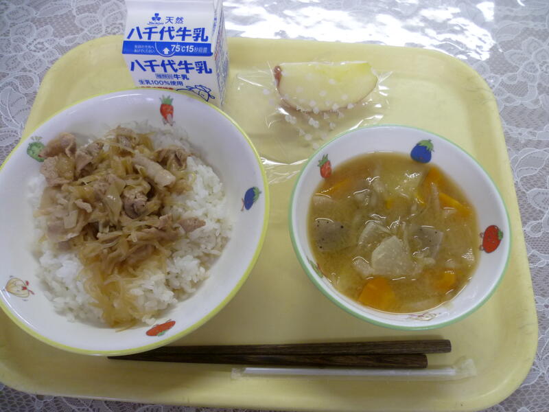ぶたすき丼、根菜汁、リンゴ(個包装)、牛乳です。