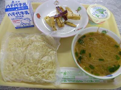 みそラーメン、スティック大学芋、牛乳プリン、牛乳です。