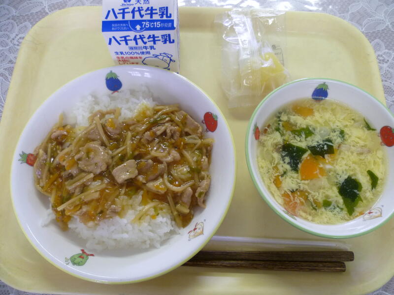 チンジャオロース丼、ワカメ卵スープ、冷凍パイン(個包装)、牛乳です。