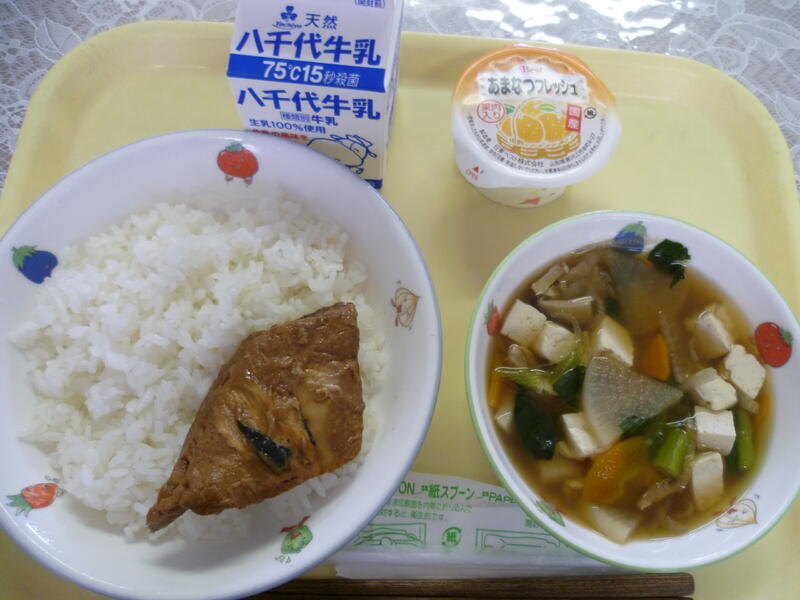 サバの味噌煮、けんちん汁、あまなつゼリー、ご飯、牛乳です。