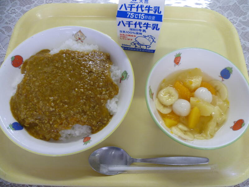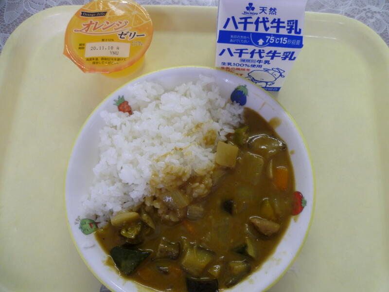 夏野菜カレー、オレンジゼリー、牛乳です。