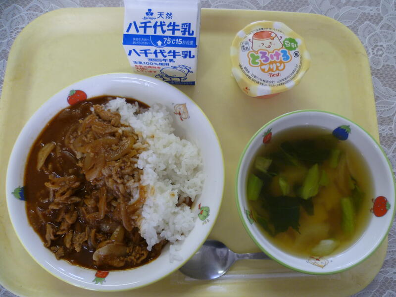 ハヤシライス、ポテトスープ、豆乳プリン、牛乳です。