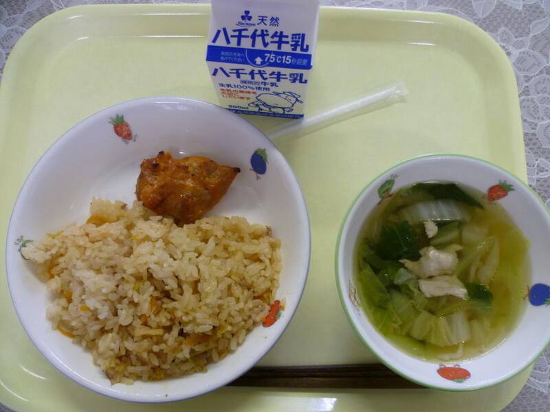 キムチごはん、鶏肉のみそケチャップ焼き、中華野菜スープ、牛乳です。