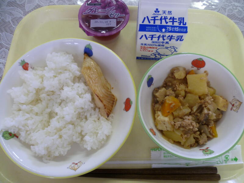 ごはん、カラスガレイのてりやき、生揚げの肉みそ煮、ぶどうゼリー、牛乳です。